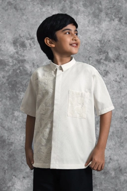 Kemeja anak ini dirancang dengan potongan Reguler Formal yang memberikan siluet rapi dan proposional. Kemeja ini memberikan sisi tegas melalui desain Asimetris yang dilapisi Brokat dengan sentuhan modern yang unik. Penggunaan Hidden Button memastikan tampilan depan menjadi clean dan minimalis, sementara detail patch pocket di dada kiri dan lengan pendek memperkuat karakter eksklusifnya. Kemeja ini sangat cocok untuk acara formal maupun momen spesial bersama keluarga.