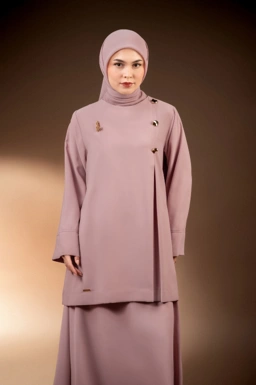 Blus baju kurung dengan siluet longgar dengan bahan Saba Twill memberikan kesan yang minimalis dan anggun.