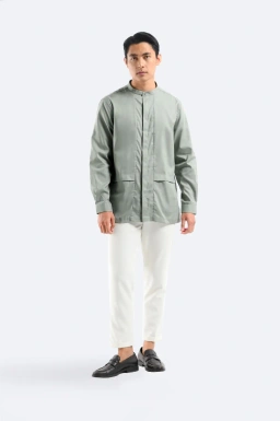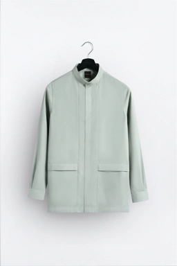 - Kemeja dengan kerah tegak dengan detail saku dalam dengan lapisan penutup pada depan pakai