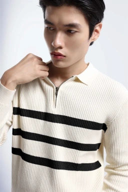 - Kemeja polo ini memiliki desain kerah klasik dan penutup half zipper di bagian depan.