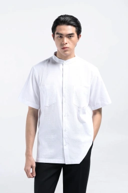 - Kemeja berkerah berdiri dengan bukaan kancing polyester