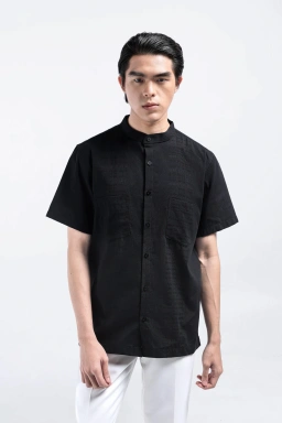 - Kemeja dengan kerah berdiri dengan detail dua saku tempel dan motif tekstur dengan ukuran Relaxed fit