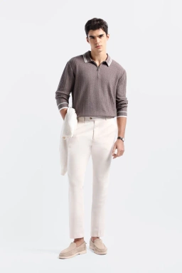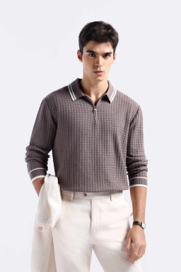 - Bukaan kemeja polo rajut dengan bukaan zipper metal