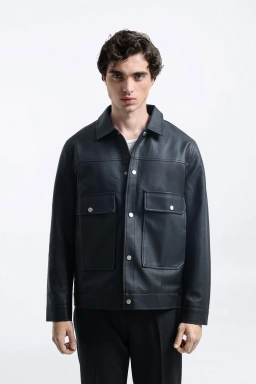 - Jaket multi saku dibuat dengan material faux leather