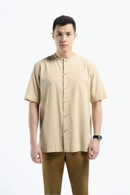 Kemeja tanpa kerah dengan material tekstur seersucker