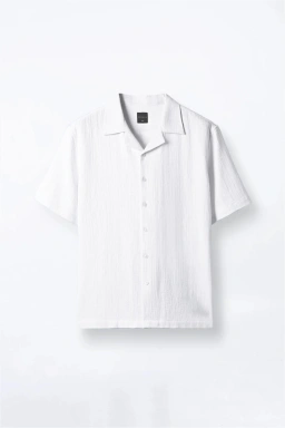 - Kemeja tanpa kerah, berukuran New Relaxed Fit material bertekstur