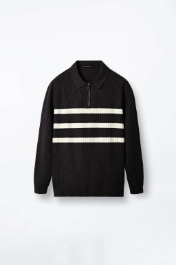 - Kemeja polo rajut bergaris lengan panjang.