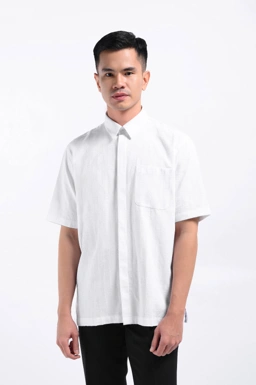 - Kemeja Kerah sudut, berukuran New Relaxed Fit dengan material bertekstur