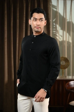 - Kemeja kerah tegak dengan material dobby tekstur