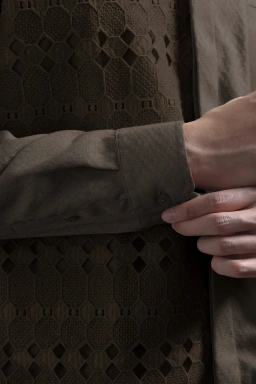 Kemeja ini dirancang dengan potongan Reguler Formal yang memberikan siluet rapi dan profesional. Kemeja ini memberikan sisi tegas melalui desain Asimetris yang dilapisi Brokat dengan sentuhan modern yang unik. Penggunaan Hidden Button memastikan tampilan depan menjadi clean dan minimalis, sementara detail Saku Bobok di dada kiri dan Lengan Panjang dengan Manset Berkancing memperkuat karakter eksklusifnya. Kemeja ini sangat cocok untuk acara formal, perhelatan mewah, maupun momen spesial penting lainnya.