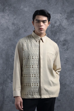 Kemeja ini dirancang dengan potongan Reguler Formal yang memberikan siluet rapi dan profesional. Kemeja ini memberikan sisi tegas melalui desain Asimetris yang dilapisi Brokat dengan sentuhan modern yang unik. Penggunaan Hidden Button memastikan tampilan depan menjadi clean dan minimalis, sementara detail Saku Bobok di dada kiri dan Lengan Panjang dengan Manset Berkancing memperkuat karakter eksklusifnya. Kemeja ini sangat cocok untuk acara formal, perhelatan mewah, maupun momen spesial penting lainnya.
