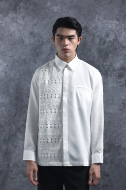Kemeja ini dirancang dengan potongan Reguler Formal yang memberikan siluet rapi dan profesional. Kemeja ini memberikan sisi tegas melalui desain Asimetris yang dilapisi Brokat dengan sentuhan modern yang unik. Penggunaan Hidden Button memastikan tampilan depan menjadi clean dan minimalis, sementara detail Saku Bobok di dada kiri dan Lengan Panjang dengan Manset Berkancing memperkuat karakter eksklusifnya. Kemeja ini sangat cocok untuk acara formal, perhelatan mewah, maupun momen spesial penting lainnya.