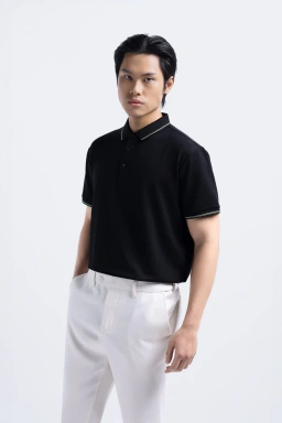 - Kemeja Polo dengan kerah rib bergaris