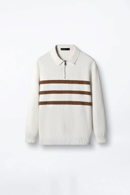 - Kemeja polo rajut bergaris lengan panjang.