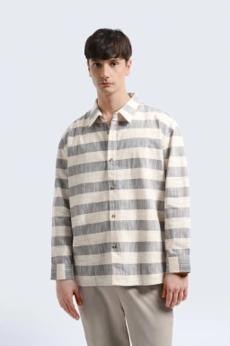 - Kemeja bermotif bergaris dengan tekstur terbuat dari material katun