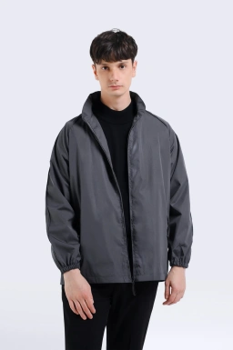 - Jacket dengan tudung terembunyi terbuat dari poliester anti air