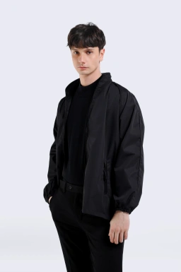 - Jacket dengan tudung terembunyi terbuat dari poliester anti air