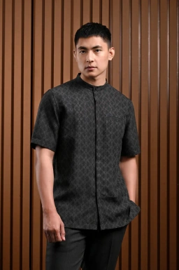 - Kemeja kerah Tegak/Sudut dengan material bertekstur dengan detail print