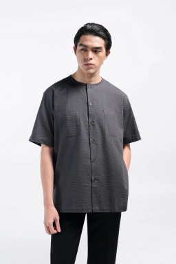 - Kemeja tanpa kerah dengan material bertekstur lembut, berukuran New Relaxed Fit