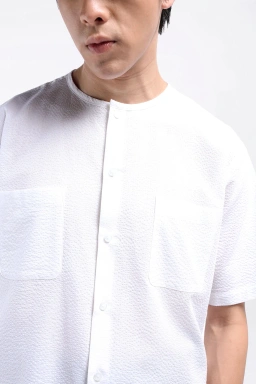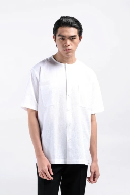 - Kemeja tanpa kerah dengan material bertekstur lembut, berukuran New Relaxed Fit