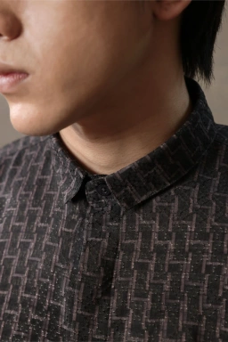 - Kemeja kerah sudut material dengan bertekstur berukuran New Relaxed Fit dengan motif Monogram .