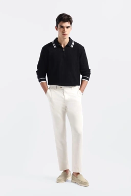 - Bukaan kemeja polo rajut dengan bukaan zipper metal