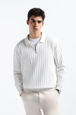 - Bukaan kemeja polo rajut dengan bukaan zipper metal