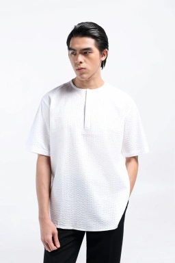 - Kemeja tanpa kerah dengan material bertekstur dengan detail plaket kancing tersembunyi dengan satu kancing tidak tersembunyi, berukuran New Relaxed Fit