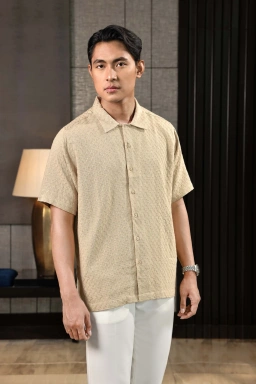 - Kemeja tanpa kerah, berukuran New Relaxed Fit material bertekstur