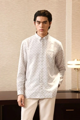 - Kemeja kerah sudut material dengan bertekstur berukuran New Relaxed Fit dengan motif Mosaic.