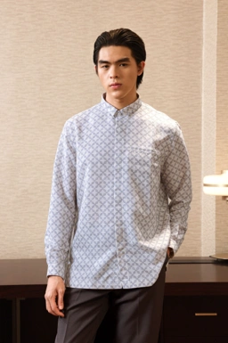 - Kemeja kerah sudut material dengan bertekstur berukuran New Relaxed Fit dengan motif Mosaic.