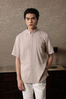 - Kemeja kerah sudut material dengan bertekstur berukuran New Relaxed Fit dengan motif Monogram .