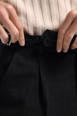 - Celana dengan motif bergaris dengan detail pada pinggang yang dapat disesuaikan agar menambah kenyamanan saat dipakai