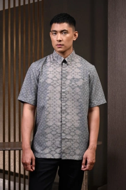 - Kemeja kerah Tegak/Sudut dengan material bertekstur dengan detail print