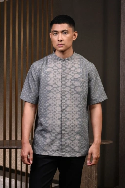 - Kemeja kerah Tegak/Sudut dengan material bertekstur dengan detail print