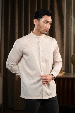- Kemeja kerah tegak dengan material dobby tekstur