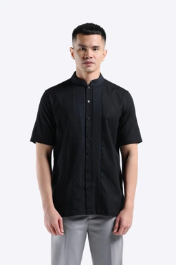 - Kemeja kerah tegak dengan detail kombinasi tekstur