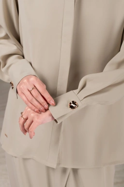 Cuff lebar dengan statement kancing gold pada manset lengan serta yoke dengan detail lipit hadap di badan belakang menambah aksen desain yang refined dan berkarakter.