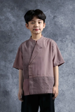 Beskap ini hadir dengan potongan Reguler Formal yang memberikan siluet tubuh tegap serta kesan gagah yang berwibawa. Desain ini menonjolkan panel depan asimetris dengan kerah Sanghai, berbalut aksen brokat yang memberikan dimensi tekstur mewah dan eksklusif khas busana bangsawan yang dikemas modern.