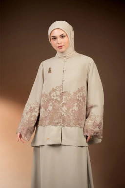 Kombinasi bahan Floral Sheer pada layer luar dan Saba Twill pada badan dalam