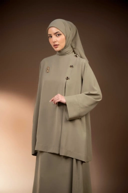 Blus baju kurung dengan siluet longgar dengan bahan Saba Twill memberikan kesan yang minimalis dan anggun.